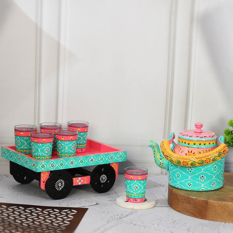 KENWIN CRAFTS HandPainted Alluminium Tea Kettle with 6 Glasses and Wooden Tray For Home Décor , Tea Party , Serving